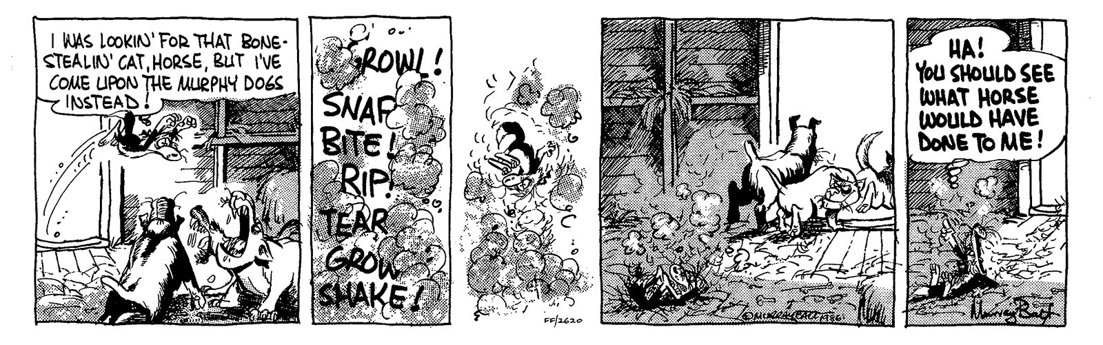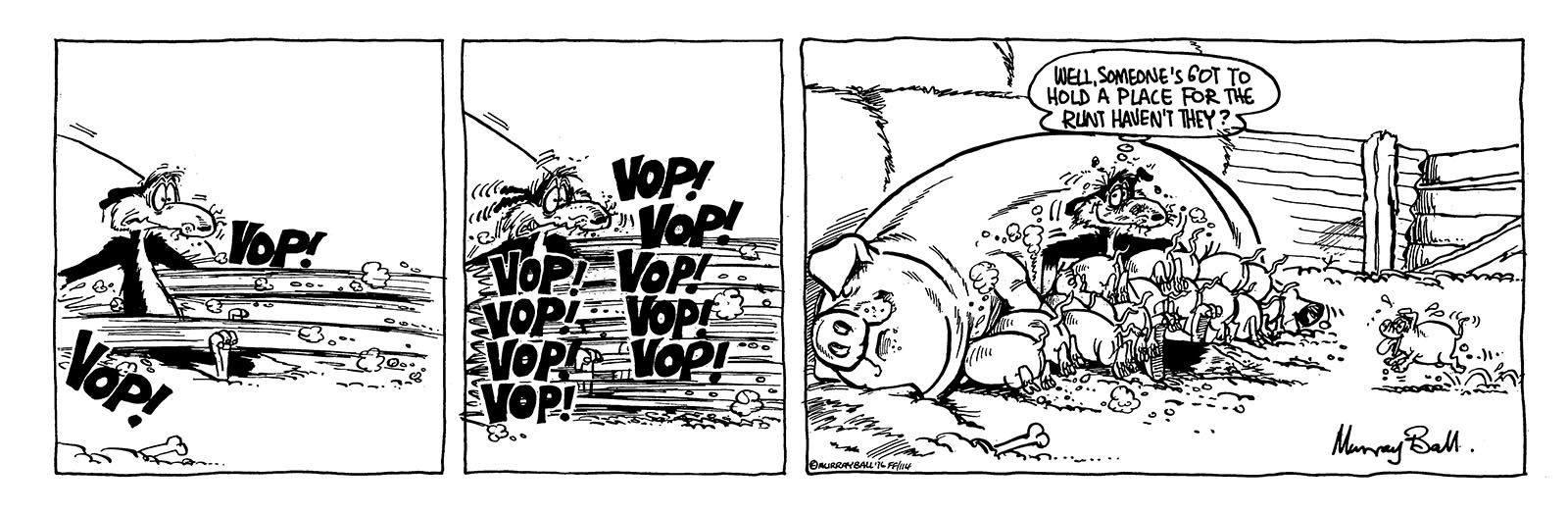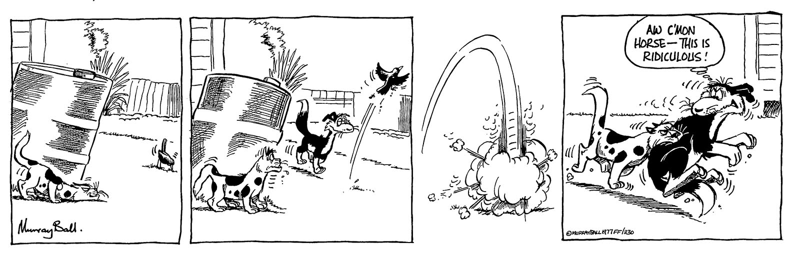 Even the mighty pig slayer Major steers clear of the gang of three known collectively as ‘The Murphy’s Hell-hounds’. They run up and down the flimsy barbed wire fences separating them from all that is decent, scowling and snarling at everything that passes by. They fear nothing and no-one …except of course…Horse