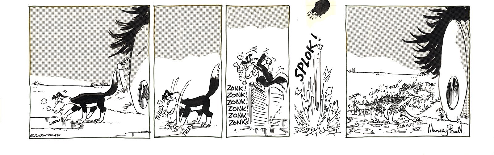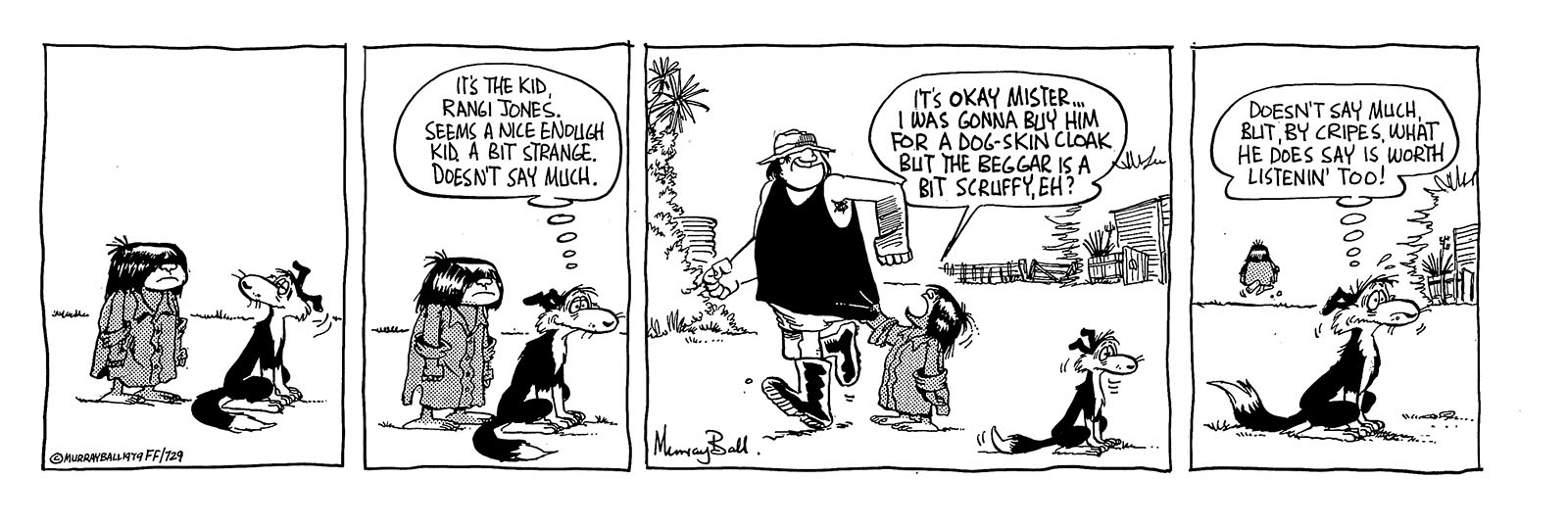Rescued by Cooch this mischievous magpie dives from the sky like a black and white kamikaze, usually toward the brim of Wal’ Footrot’s hat. While many stake their claim on the patch of dirt known as Footrot Flats, there is no argument over who rules the sky above it. Look out! Here he comes again!
