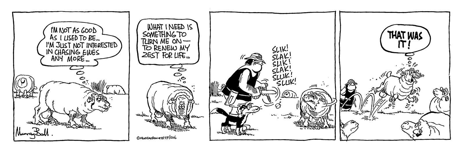 He seldom climbs on to a ewe for anything other than a quiet nap. A ram that does little more than wink rakishly before dozing off. Wal occasionally pops him in with his ewes just to see the ‘hunted’ expression on his face and watch him try to climb back over gate